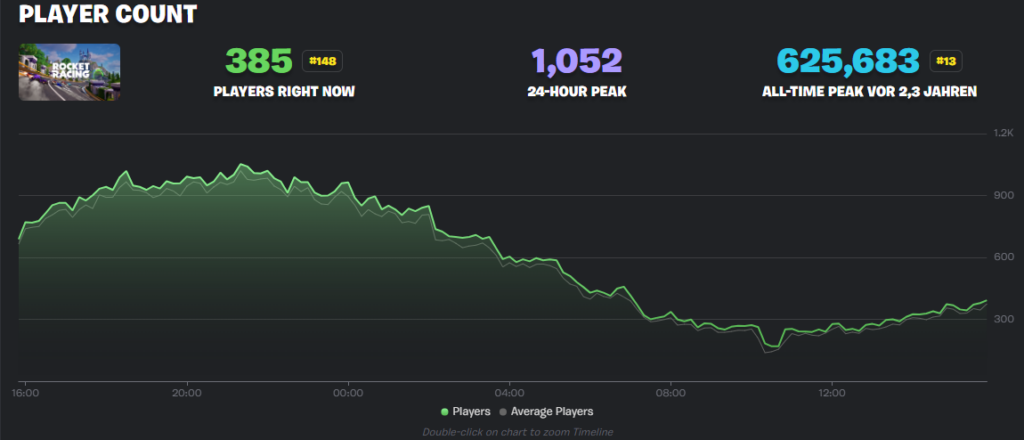 Rocket Racing feierte am 8. Dezember 2023 einen fulminanten Start mit über 625.000 gleichzeitigen Spielern. Doch dieser Hype verflog schnell; zuletzt verzeichnete der Modus im Durchschnitt nur noch magere 969 Nutzer. Noch düsterer sieht es bei der Festival Battle Stage aus. Selbst zu ihrem Allzeithoch erreichte sie nie mehr als 2.833 Spieler und dümpelte zuletzt bei etwa 777 aktiven Fans herum. Auch der 5v5-Shooter Ballistic verlor massiv an Boden. Trotz eines soliden Starts vor 16 Monaten schrumpfte die Spielerzahl zuletzt auf rund 4.300 Personen zusammen.