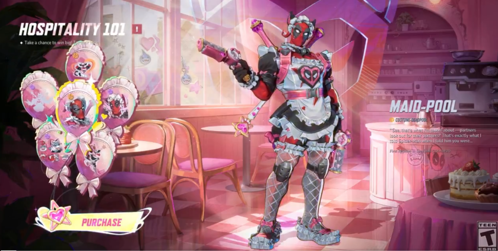 Deadpool bekommt einen legendären Look namens Maid-Pool. Dieser Skin basiert auf dem Comic Deadpool (2008) #20. Ihr schaltet diesen Skin über das neue „Hospitality 101“ Event frei. Dabei kommt eine bekannte Mechanik zum Einsatz: das Gacha-Ballon-Event.