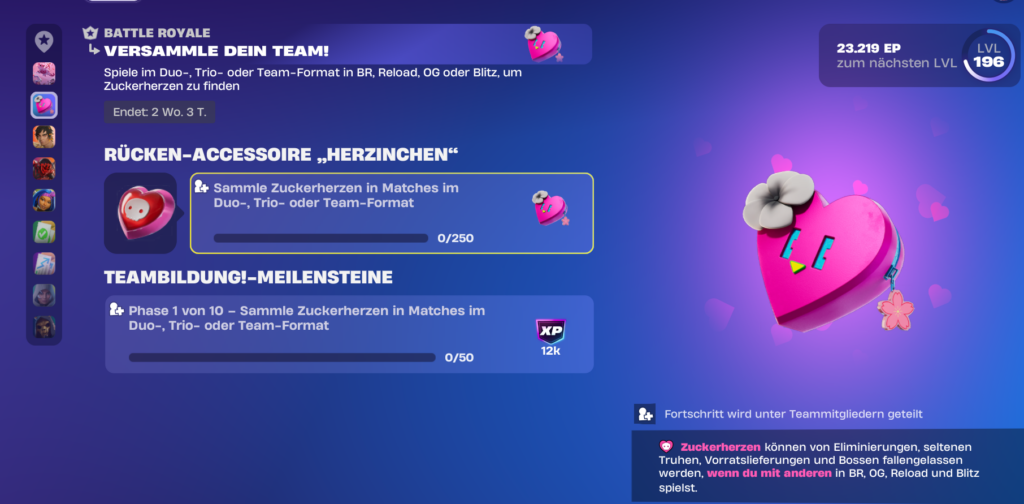 Deine Aufgabe: Zuckerherzen sammeln. Epic Games nutzt für dieses Event die bekannten Shiny Llama Aufgaben erneut. Deine wichtigste Aufgabe ist das Sammeln von Zuckerherzen während deiner Spielrunden. Diese süßen Gegenstände sind ein fester Bestandteil der aktuellen Aufträge. Du erledigst diese Aufgaben zusammen mit deinen Freunden in Duos, Trios oder Squads. Das Sammeln der Herzen bringt dich Schritt für Schritt näher an deine Belohnungen.